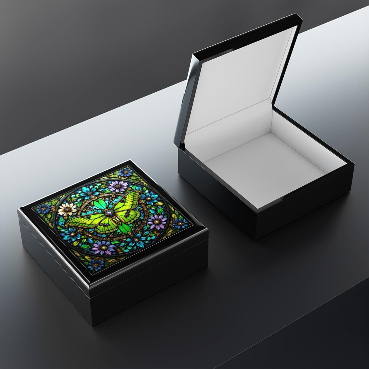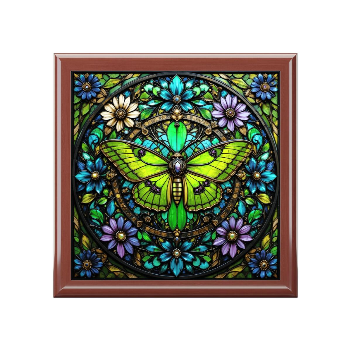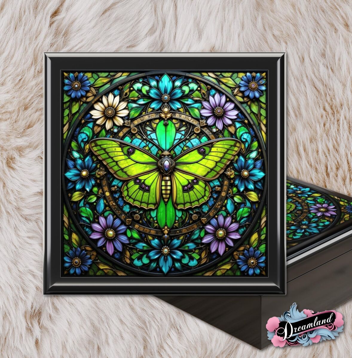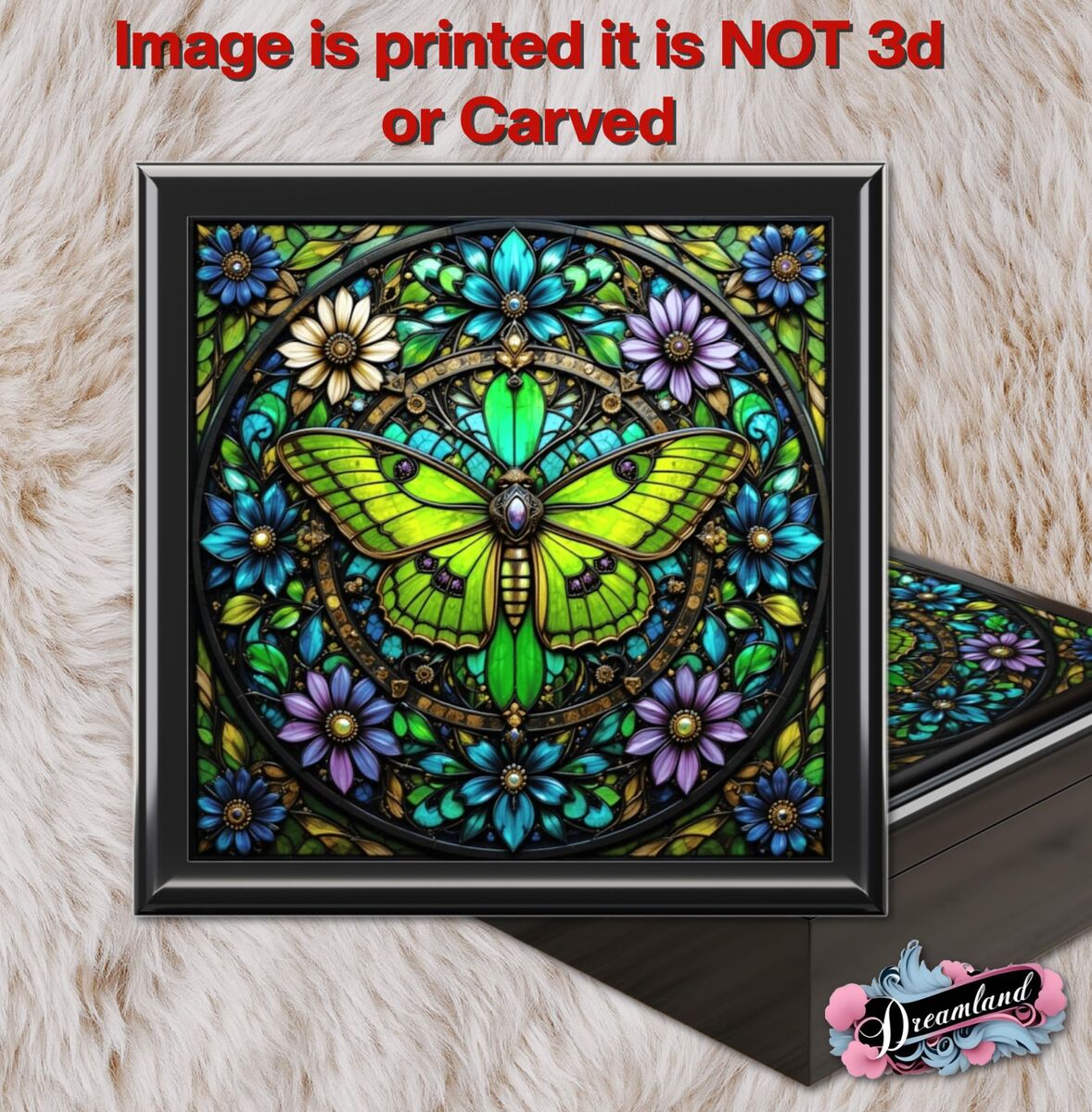 Witchy Luna Moth Nouveau Wood Jewelry Box Magical Printed Stained Glass Style Keepsake Butterfly Gift Memory Box