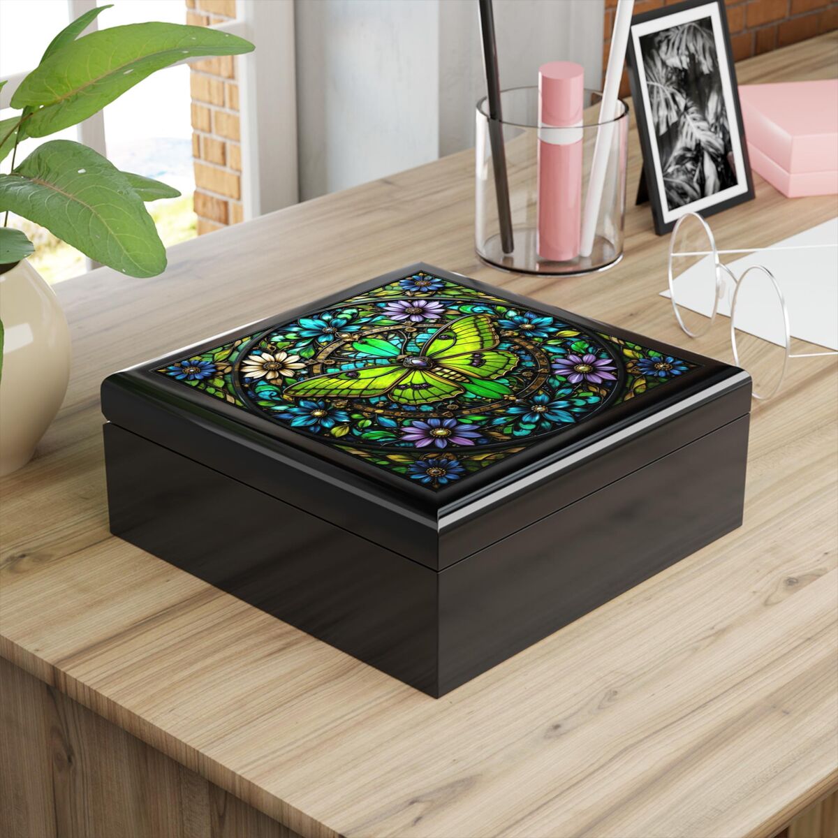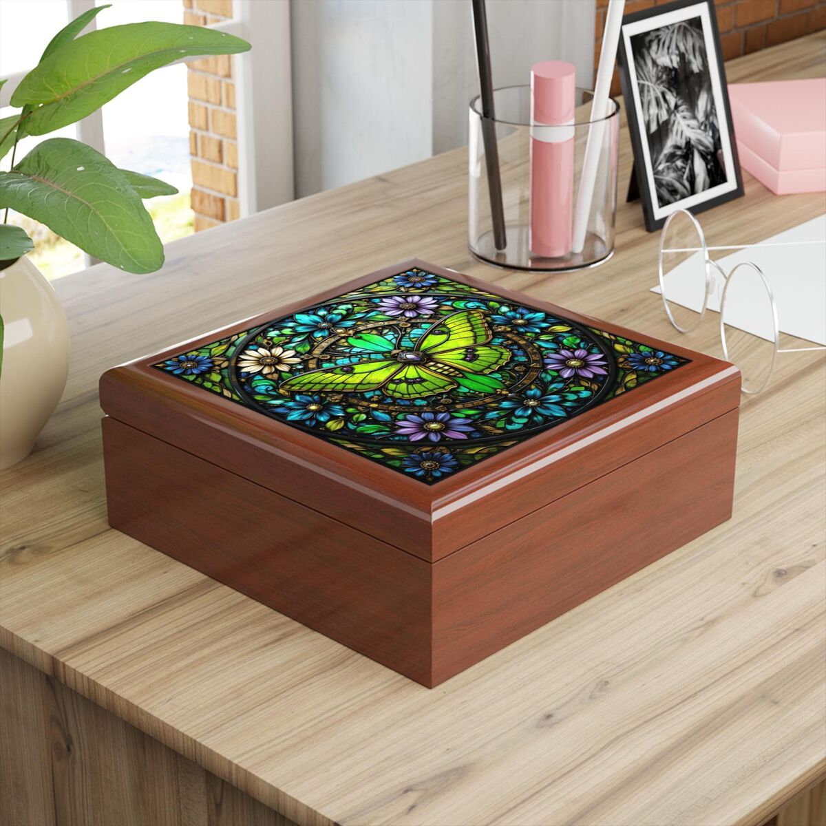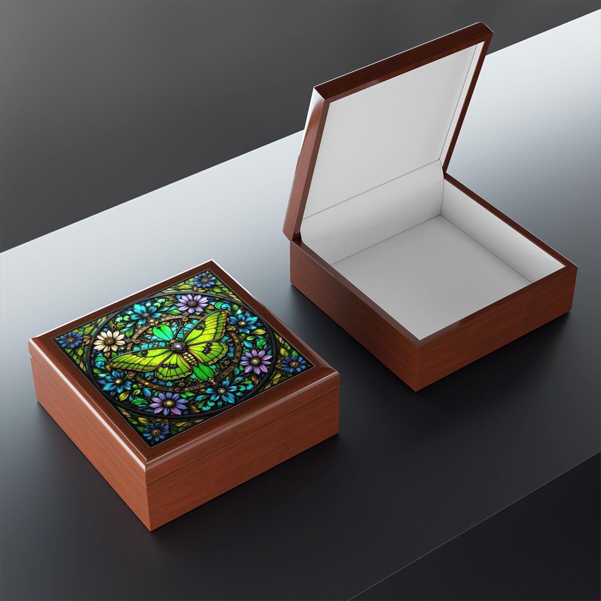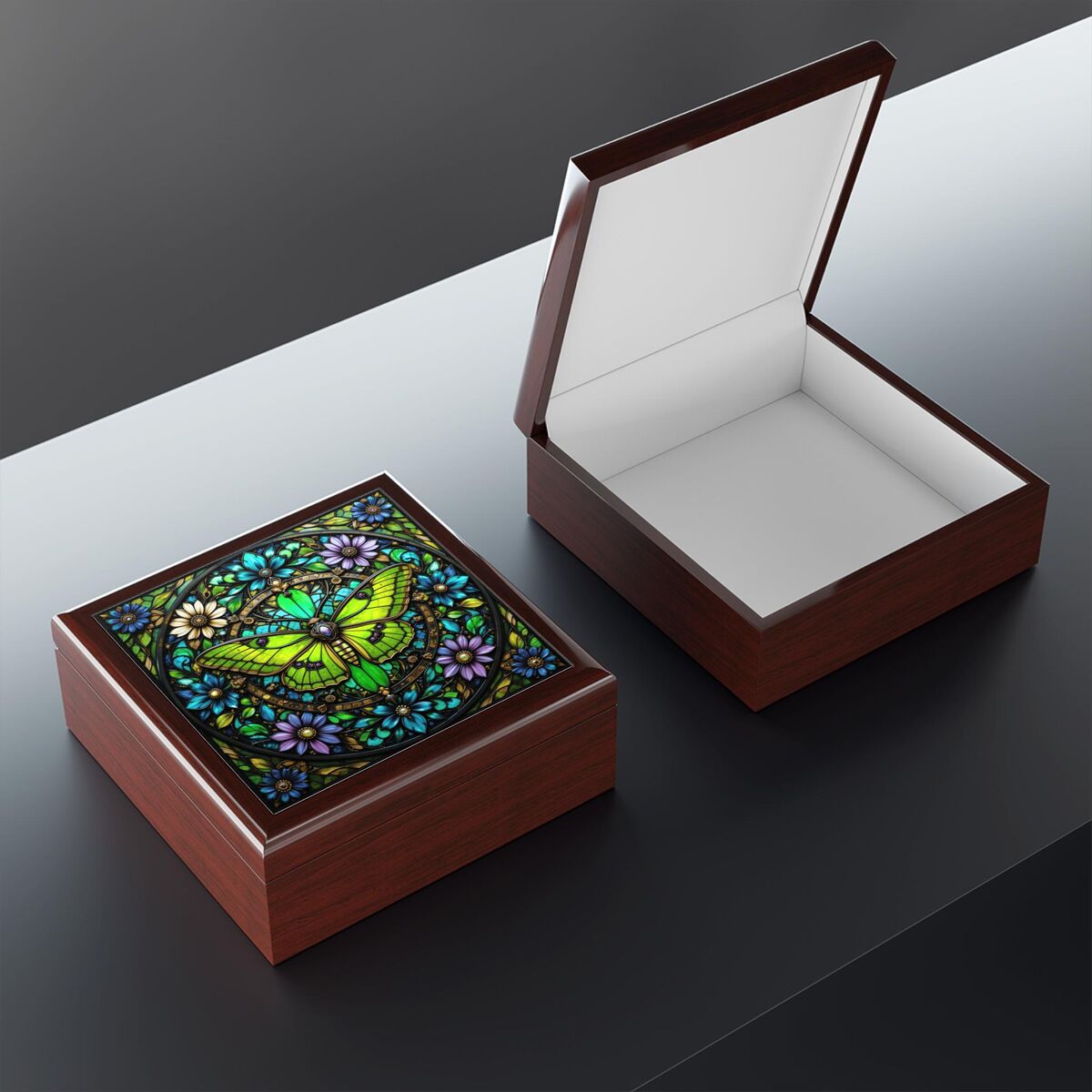Witchy Luna Moth Nouveau Wood Jewelry Box Magical Printed Stained Glass Style Keepsake Butterfly Gift Memory Box