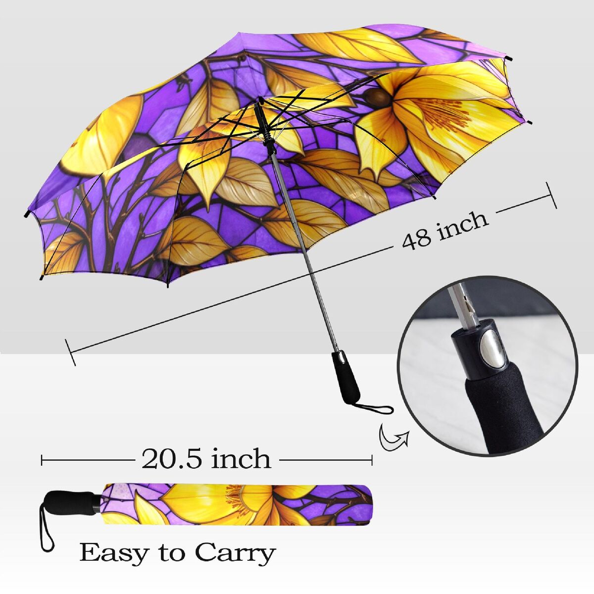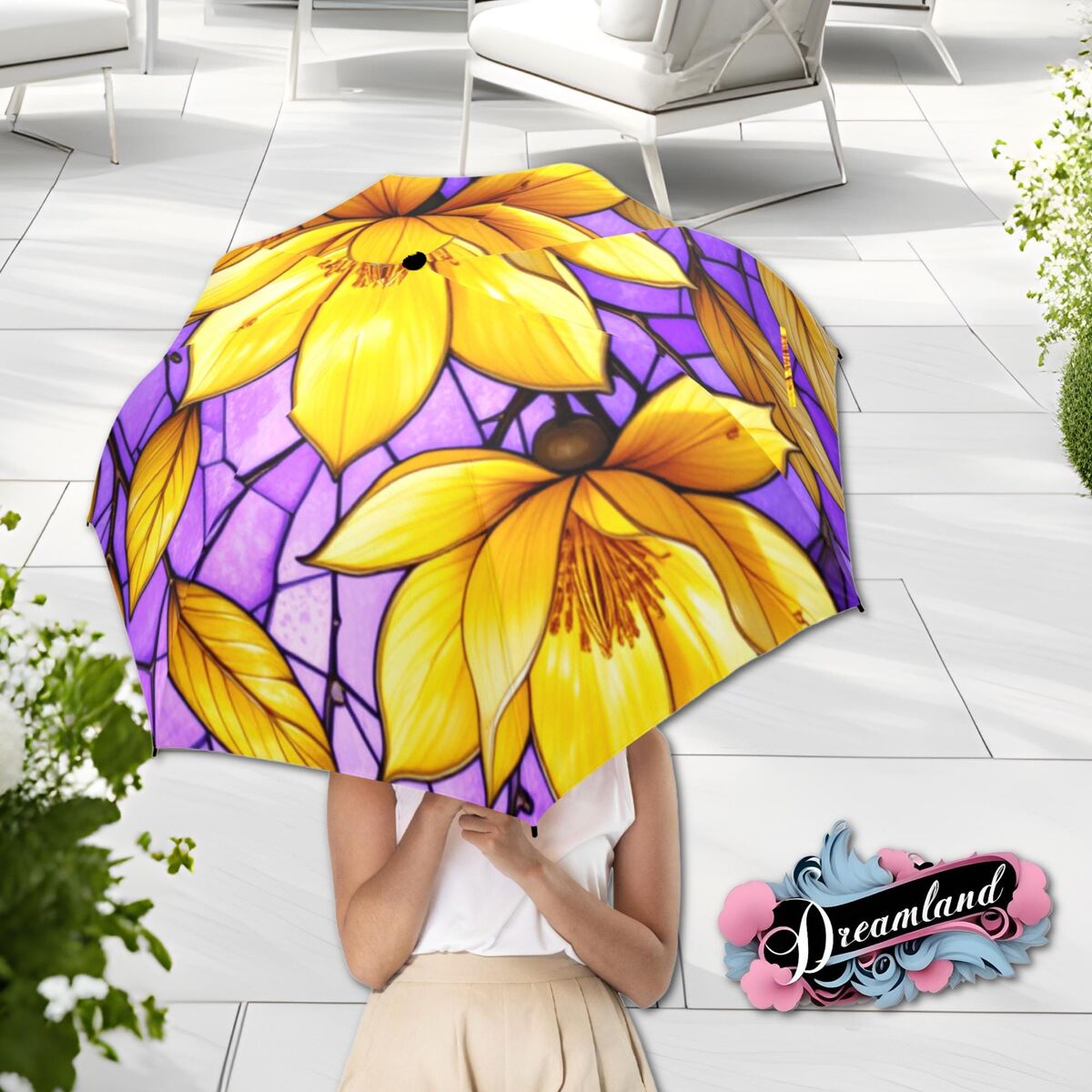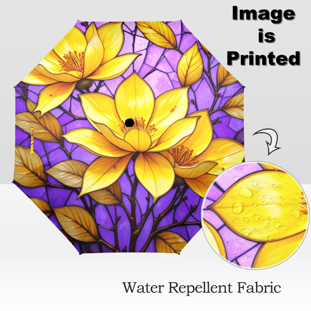 Yellow Magnolia Umbrella Romantic Art Nouveau Faux Stained Glass Parasol Semi-Automatic Waterproof Foldable Umbrella